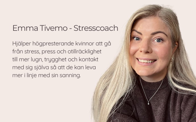 Jag heter Emma Tivemo och är stresscoach. Jag hjälper högpresterande kvinnor som lever med stress, press eller en känsla av otillräcklighet att stanna upp, lyssna inåt och börja leva mer i linje med sig själva och sin sanning.