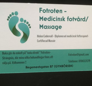Mjukgörande fotbad, naglar klipps, rensas och slipas efter behov. Förhårdnader, liktorn, svamp, vårtor (Max 3 st) nageltrång tas om hand samt planering av ev efterföljande behandling planeras.